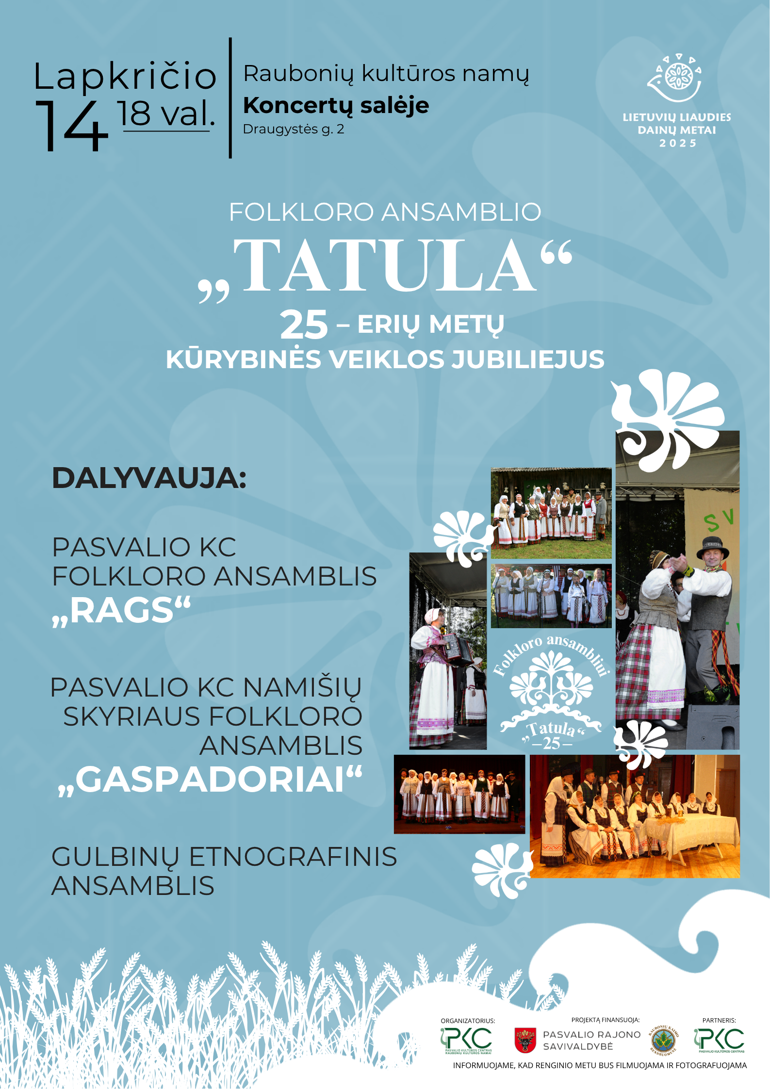 Folkloro ansamblio „Tatula“ 25-erių metų kūrybinės veiklos jubiliejus Data 2025 11 14 Laikas 18:00 - 20:00 Vieta Raubonių kultūros namai Draugystės g. 2, Raubonių k., Pasvalio r. Kategorija Kultūra Pasidalinti šiuo renginiu