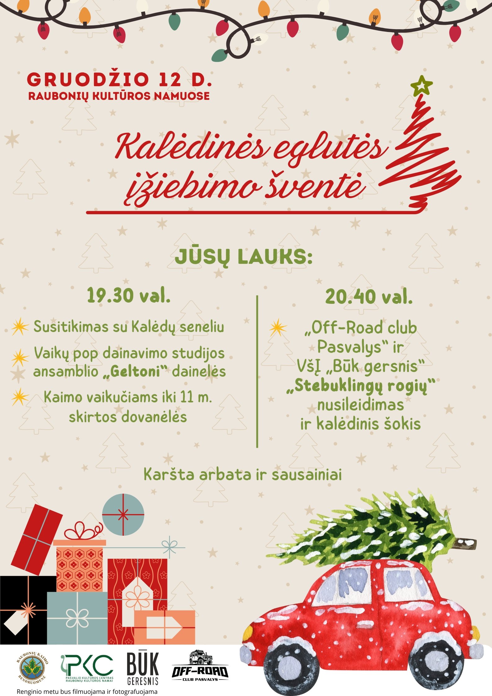 Kalėdinės eglutės įžiebimo šventė Data 2025 12 12 Įvykęs renginys... Laikas 19:30 - 21:00 Vieta Raubonių kultūros namai Draugystės g. 2, Raubonių k., Pasvalio r. Kategorija Bendruomenė Kultūra Pasidalinti šiuo renginiu