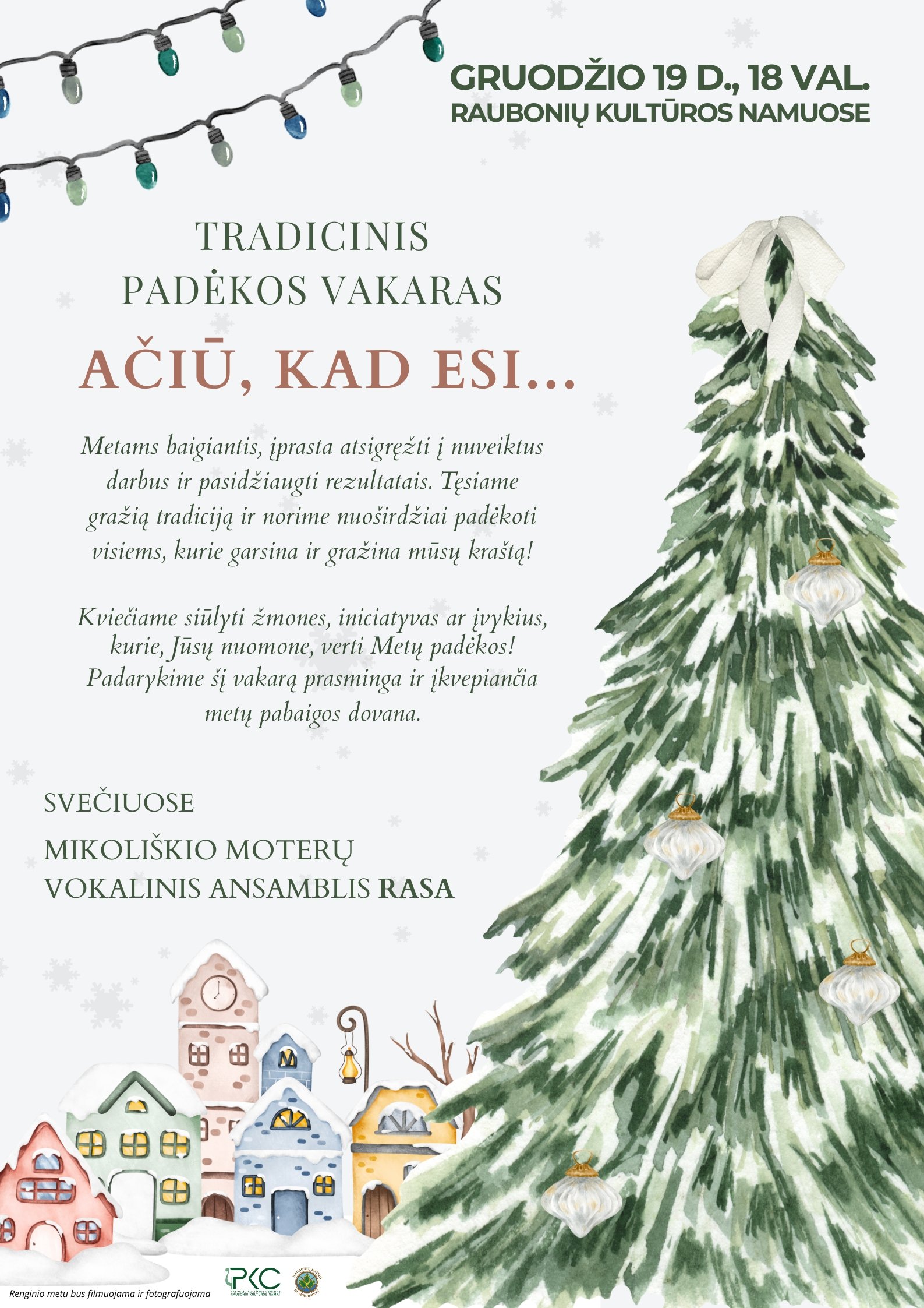 Padėkos vakaras „Ačiū, kad esi…“ Data 2025 12 19 Įvykęs renginys... Laikas 18:00 - 19:30 Vieta Raubonių kultūros namai Draugystės g. 2, Raubonių k., Pasvalio r. Kategorija Bendruomenė Kultūra Pasidalinti šiuo renginiu