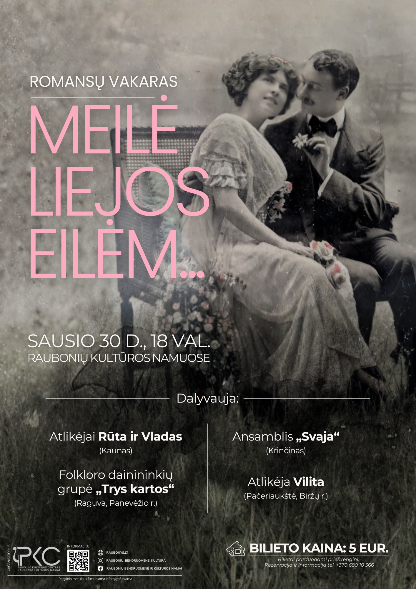 Romansų vakaras „Meilė liejos eilėm…“ Data 2026 01 30 Įvykęs renginys... Laikas 18:00 - 19:30 Kaina 5.00 € Vieta Raubonių kultūros namai Draugystės g. 2, Raubonių k., Pasvalio r. Kategorija Kultūra Pasidalinti šiuo renginiu